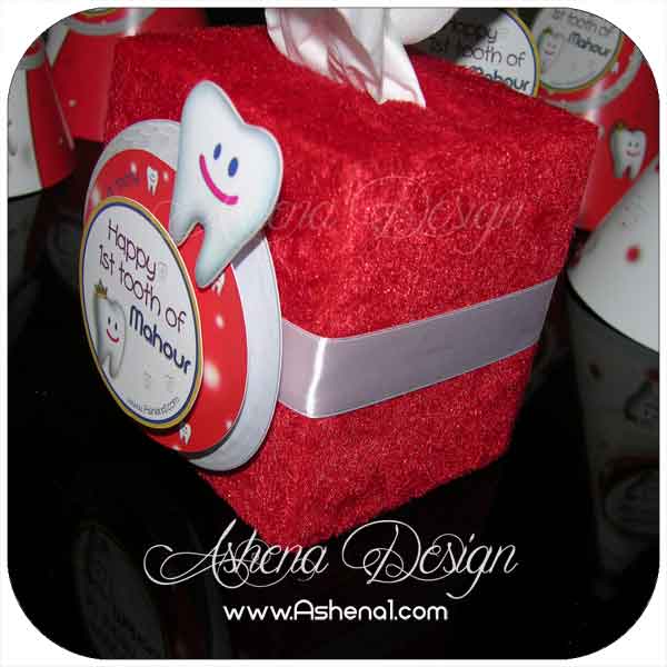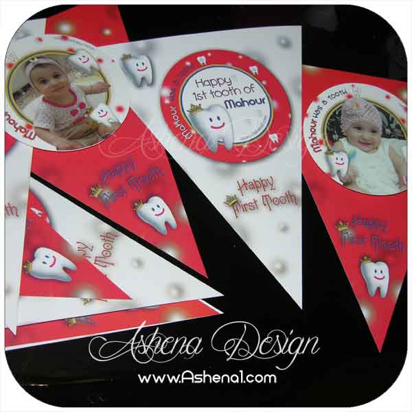 ریسه مثلثی جشن دندونی قرمز و سفید با عکس کودک به صورت برجسته و نام کودک و زمینه رنگی متناسب