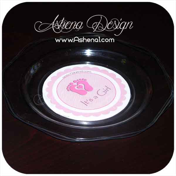 بشقاب شفاف با تزیین لیبل تم جشن نوزاد دخترانه baby و نام کودک ( تزیین کاغذی تم با روکش ضد آب )، در دو سایز کیک خوری و غذا خوری ،در بسته های 6 عددی.