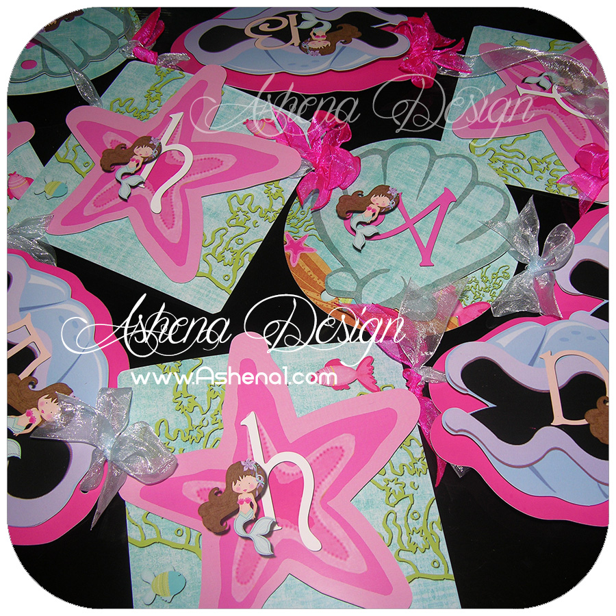 ریسه بسیار زیبا با نام کودک و طرح و اشکال تم پری دریایی (و هپی برتدی )بر روی مقوای ضخیم یا کتان مناسب برای نصب روی دیوار یا روی میز