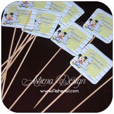 خلال بلند یا تاپر با طرح تم یک سالگی میکی موس مناسب برای تزیین روی غذا و یا کاپ کیک در بسته های 6 عددی طراحی شده با نام کودک