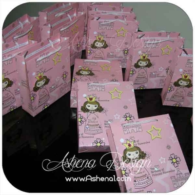 کیسه های پلاستیکی چسبدار پرنسسی جهت تنقلات یا هدایای مهمانان با لیبل مقوایی، لیبل برجسته و نام کودک