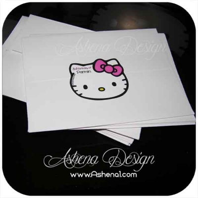 کارت دعوت هلو کیتی با نام کودک طراحی و اجرا میشود و کیتی آن می تواند به صورت برجسته بر روی کارت نصب شود .